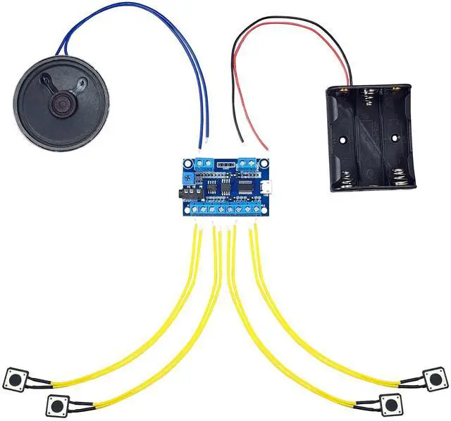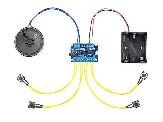 Support audio format: MP3 and WAV Able to play multiple audio files on per button. Built-in a class D 3Watts amplifier IC and a 3.5 mm audio Directly drives a 0.5W atts to 3Watts (4ohms to 8ohms) speaker Volume is adjustable through adjusting the blue potentiometer Built-in headphone output for easy use if the external speaker is not something that will work with your project. 4-Key Operations with 7 Triggering