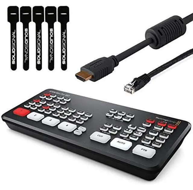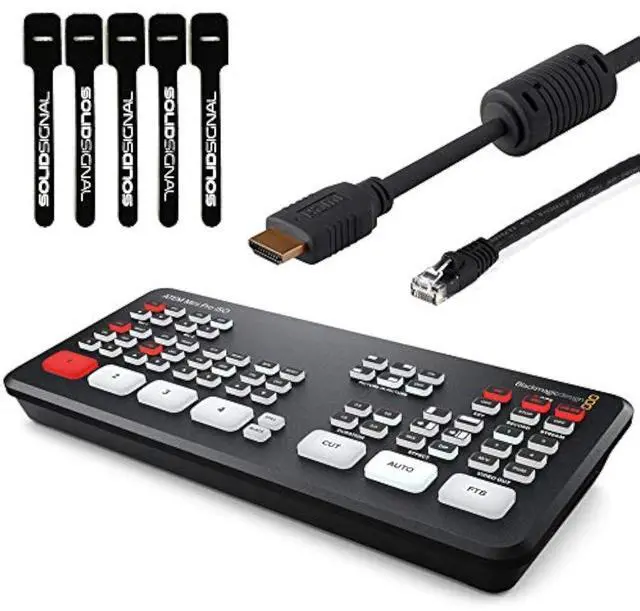 Bundle includes ATEM Mini Pro ISO HDMI Live Stream Switcher, 6ft HDMI cable, 7ft Cat5e Patch Cable, 5-pack of Solid Signal Cable Ties