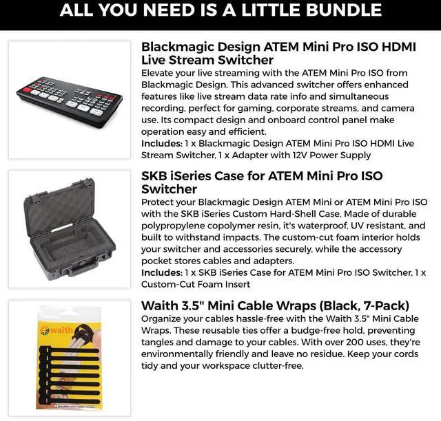 Bundle Includes: #Blackmagic Design ATEM Mini Pro ISO Switcher4-Channel Live Stream HDMI SwitcherProgram and 4 x Input ISO RecordingGenerates DaVinci Resolve ProjectLive Tally, Stream, and Record StatusRecord Button, Channel Preview Multiview2-Channel Digital Audio Mixer per SourceHDMI Output, Ethernet ATEM ControlMedia Player, Computer Input Support#SKB iSeries Case for ATEM Mini Pro SwitcherCustom-Cut Foam for ATEM Video SwitchersFits Switcher Power Supply and AccessoriesRubber Overmolded Cushion Grip HandleResists UV Solvents and CorrosionLoops for Optional Locks#Waith 3.5" Mini Cable Wraps (Black, 7-Pack)Durable hook and loop designReusable for over 200 timesResidue and damage-freeProvides a solid hold without slipping