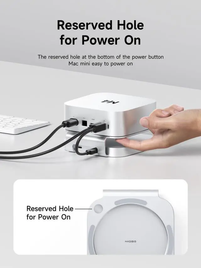 High Efficiency Heat Dissipation: Hagibis Mac Mini M4 Stand has aluminum alloy material which has good heat dissipation effect. And raise the middle design fot better ventilation and heat dissipation. *Note: We have reserved a Mac Mini M4 power on hole in the stand for easy users to power on the Mac Mini M4 at the bottom