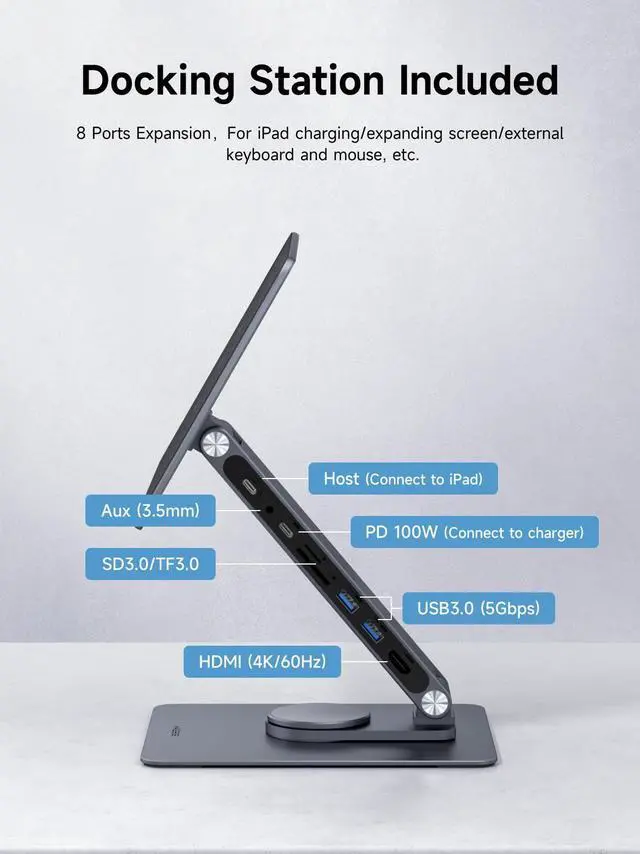 2-in-1 Stand & Hub: Hagibis innovative technology combines iPad stand and docking station make it more convenient. You can not only have a magnetic tablet stand but also have a USB-C docking station with 4K@60Hz HDMI, 100W Power Delivery, 2*USB 3.0, AUX and SD/Micro SD Card Reader