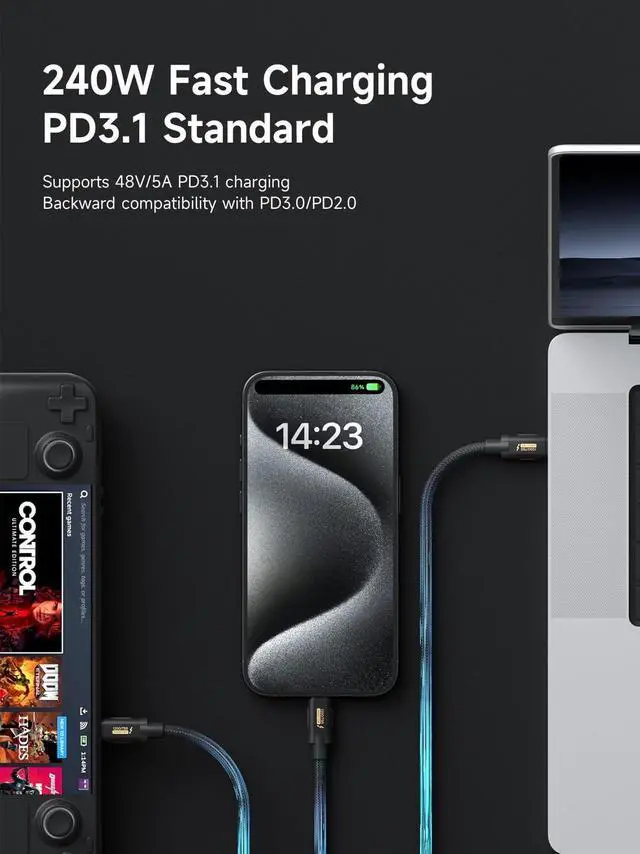 High Power Delivery: With the capability to deliver up to 240W of power and support for PD 3.1, this Thunderbolt 5 cable is a powerhouse for charging high-performance laptops, tablets, and other devices efficiently. Eliminate the clutter and hassle of multiple cables and power adapters in your workspace, as this Thunderbolt cable for Mac provides a high-speed charging solution alongside superior data and video capabilities ^^ 16K@60Hz
