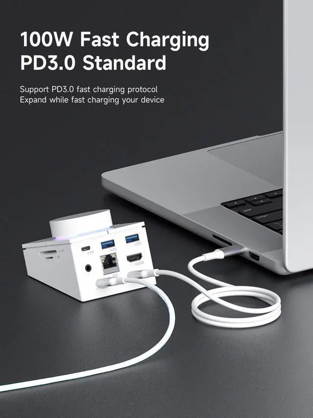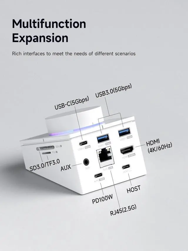 Unique Integrated USB-C Docking Station: Hagibis innovated and developed this multi-function USB C Hub, which integrates 9-in-1docking station & RGB Light & Volume Knob & Shortcut Buttons, make your docking station different from the rest, add color to your desktop ^^
