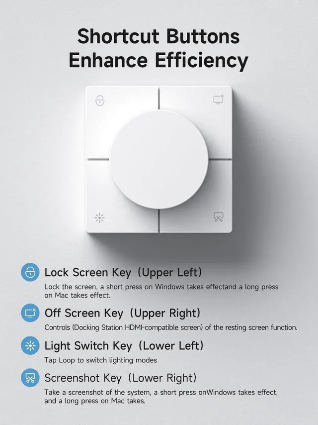 Multifunction Button: Hagibis UC-1102A USB C hub not only expands with nine ports, but also can adjust the volume and mute with a knob, it also has four shortcut buttons to lock the screen, turn off the screen, take a screenshot, and adjust the lighting ^^ 4K@60Hz