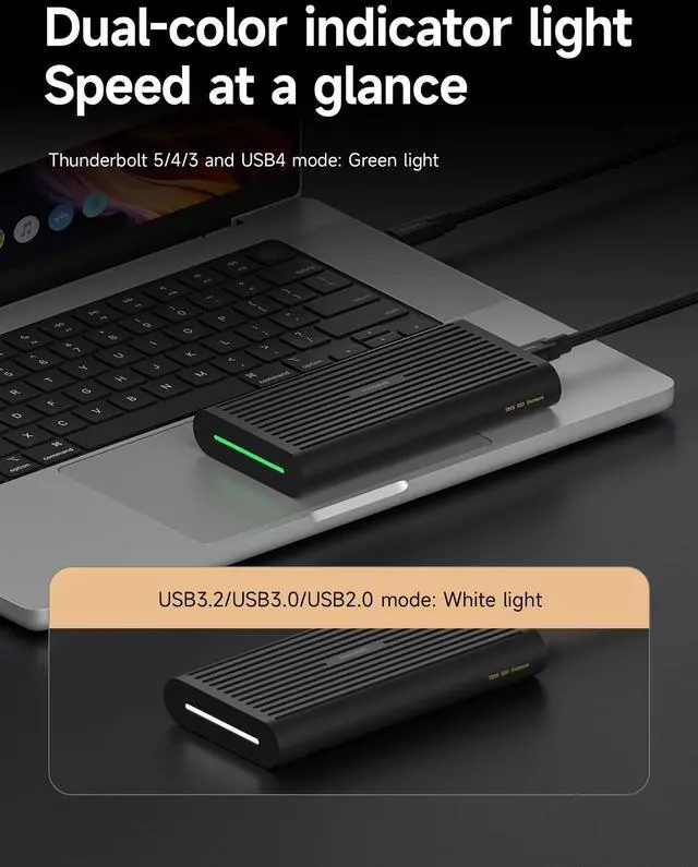Dual-color Indicator: Green light means Thunderbolt 5/4/3 and USB4 mode; White light means USB 3.2 /USB 3.0 /USB 2.0 mode. The speed of transmission can be clearly seen at a glance ^^
