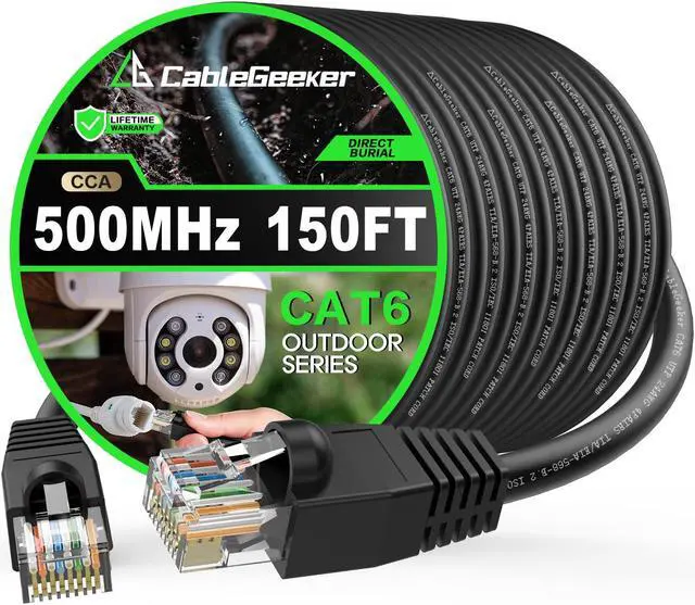 CableGeeker Cat6 Outdoor Ethernet Cable 150 ft CCA Copper Clad, Heavy Duty Internet Network Cable, Direct Burial, Waterproof, In-Ground, POE, UV Jacket, 24AWG Cat 6 RJ45 Patch Cable - 150ft, Black