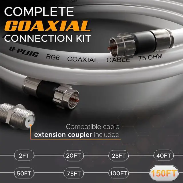 G-PLUG 150FT RG6 Coaxial Cable Connectors Set - High-Speed Internet, Broadband and Digital TV Aerial, Satellite Cable Extension - Weather-Sealed Double Rubber O-Ring and Compression Connectors White