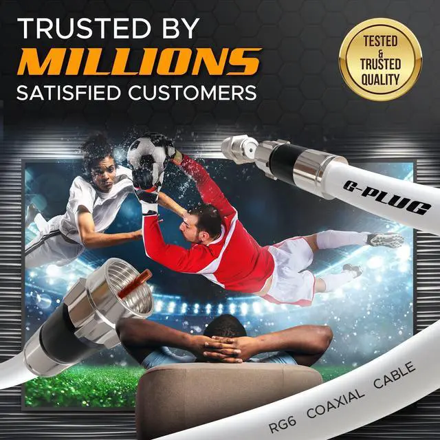 UNLIKE OTHER COAX CONNECTORS THAT give you a SPOTTY SIGNAL and an INCONSISTENT connection, the G-PLUG 75ohm Standard Shield RG6 Cable provides a solid, RELIABLE CONNECTION and effectively extends your signal, due in part to its nickel-plated brass COMPRESSION connectors - known as the best type of F connectors to shield signals from noise. Our F type connector is compatible with all RG6-wired devices: BROADBAND & high-speed Internet, SATELLITE TV, digital TV, and more.