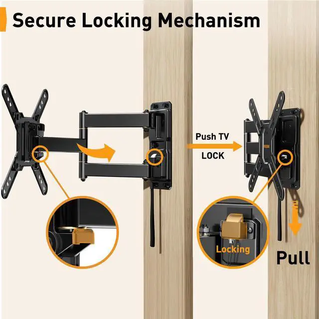 Pull Cord Locking Mechanism: The Perlegear RV TV mount features a pull cord locking mechanism that keeps your TV steady and stable--even on rough terrain. With just a pull of the cord, the highly reliable lock can easily be quick released to extend the TV out when parked, making it the perfect addition for your on-the-go lifestyle.