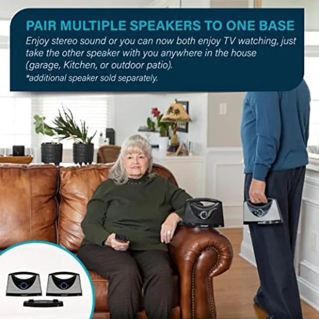 SEREONIC television speakers for hearing impaired designed with durable materials that are designed to last, our wireless TV speakers for smart TV are second to none. This portable TV voice amplifier features the following: Wireless speaker with a charging docking station. Listening Time of 8 hours @ 50% level 1 hour sleep timer (once activated, the speaker shuts off after 1 hour). Headphones/wired earbuds connectivity. User replaceable battery. 3-tone control to adjust audio to your hearing.