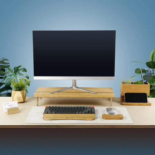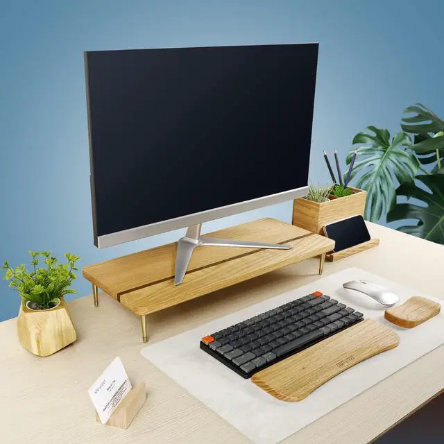 Premium Red Oak wood monitor stand: Our computer stand for desktop is made of Premium Eco-friendly Red Oak spliced with American walnut wood, made of 100% whole wood, without any air pollution. Moreover, We Using The Professional Craftsman Exquisitely Polished & Painting Finish For A Long-lasting Life.