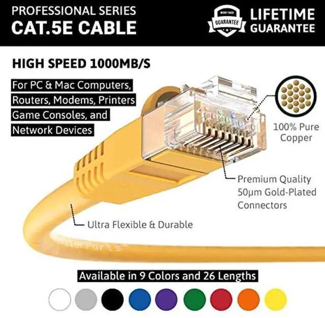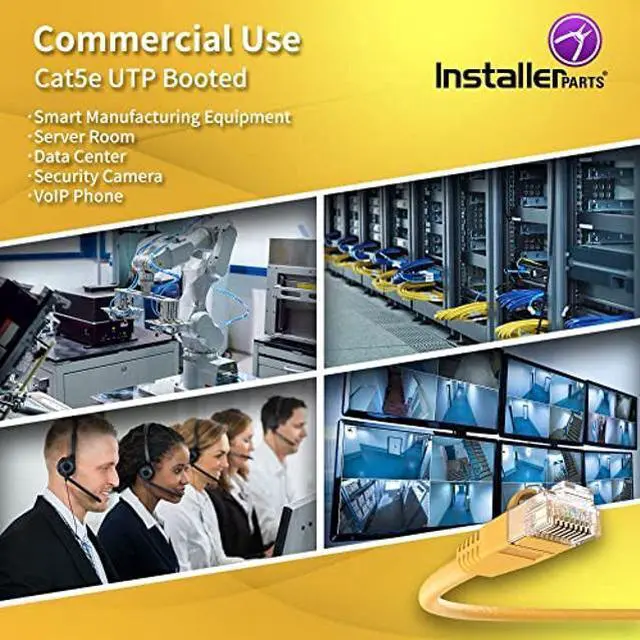 InstallerParts Cat5e Network Patch Cables offer connectivity to computers and network components such as routers, switch boxes, network printers, network attached storage (NAS) devices, VoIP phones and more. InstallerParts Cat5e patch cables are available in 26 different lengths ranging from 0.5 foot to 200 feet and in a variety of colors (black, blue, gray, green, orange, purple, red, white and yellow). This cable provides exceptional transmission performance and low signal losses. It supports up to 350 MHz and is suitable for fast gigabit ethernet. All InstallerParts Cat5e cables are made of 100% bare copper wire as opposed to copper clad aluminum (CCA) wire, therefore fully compliant with UL Code 444, which requires pure bare copper wire in communications cables.