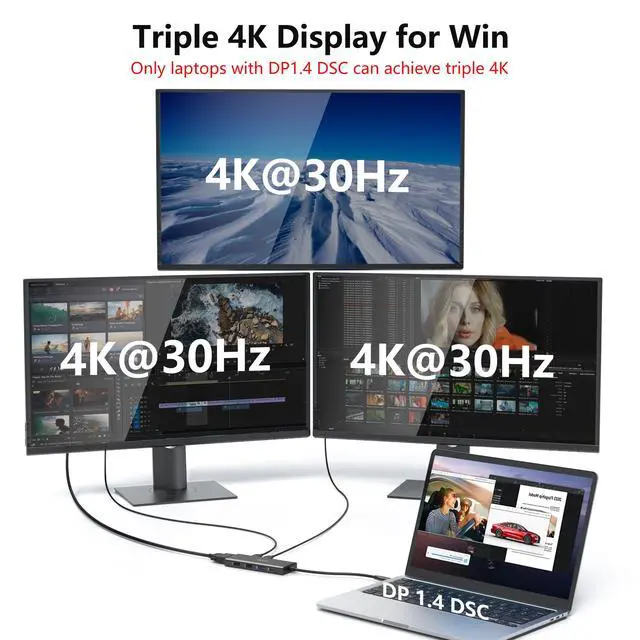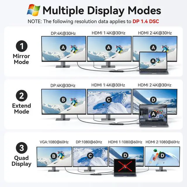 Laptop Docking Station 4K Display Adapter: The USB C Docking Station Dual HDMI Splitter with 4 video output ports: 2 HDMI+DP+VGA. For single display, HDMI can reach 8K@30HZ or 4K@144HZ; For dual display and triple display, Can output up to 4K Dual/Triple Display videos(For laptop with DP 1.4 DSC); For quadruple display, Dual HDMI, DP, and VGA all are 1080@60Hz. Please make sure your laptop specification support DP1.4 signal output. If the VGA port is connected, it will affect the resolution of all displays up to 1080P only