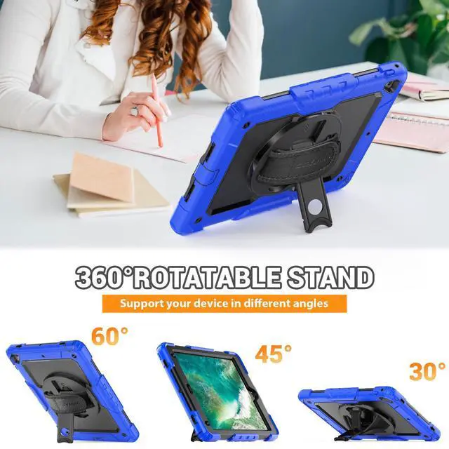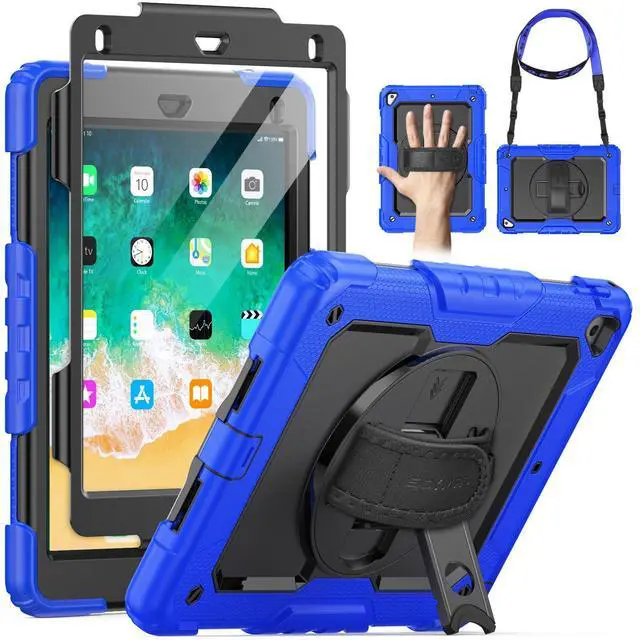 SEYMAC Case for iPad 6th/5th Generation 9.7 Inch, Full-Body Shockproof Heavy Duty Protective Case with Screen Protector, Rotating Stand/Hand/Shoulder Strap for iPad Air 2/ Pro 9.7, Dark Blue