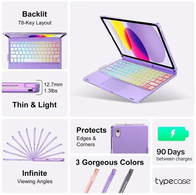 KVAGO Keyboard Case for iPad 10th Generation (2022 10.9" ) & iPad 11th Generation (A16, 2025), Multi-Touch Trackpad, 7 Color Backlight Keyboard, 360° Rotatable Smart Case, Thin & Light, Purple