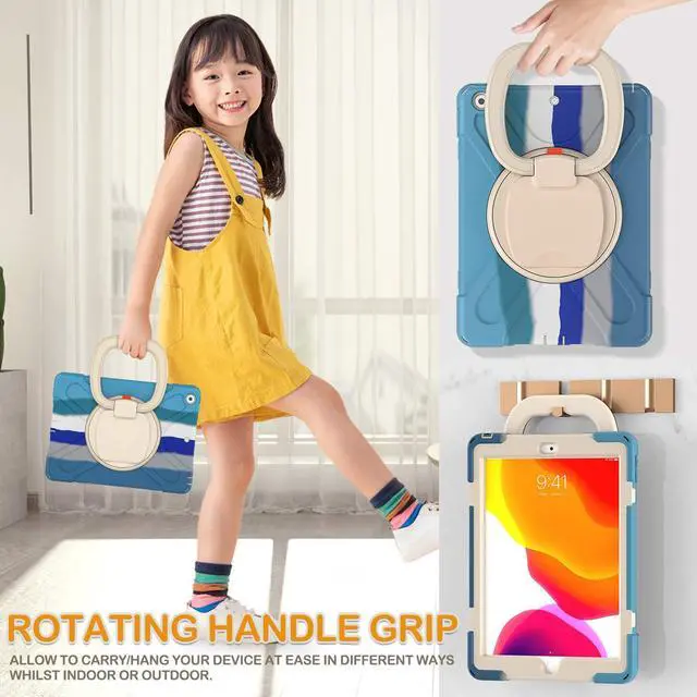 BRAECN for iPad 9th 8th 7th Generation 10.2 Inch Case,Heavy Duty Silicone Case w/Carrying Strap/Pencil Holder/Screen Protector/Folding Handle Grip/Kickstand for iPad 9/8/7 Generation, Colorful Blue