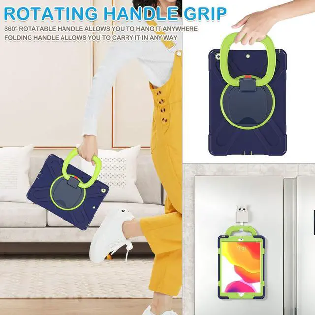 BATYUE for iPad 9th/ 8th/ 7th Generation Case (iPad 10.2 inch Rugged Case 2021/2020/2019) with Screen Protector, Rotating Stand/Pencil Holder/Carrying Shoulder Strap (Navy Blue+Lime)
