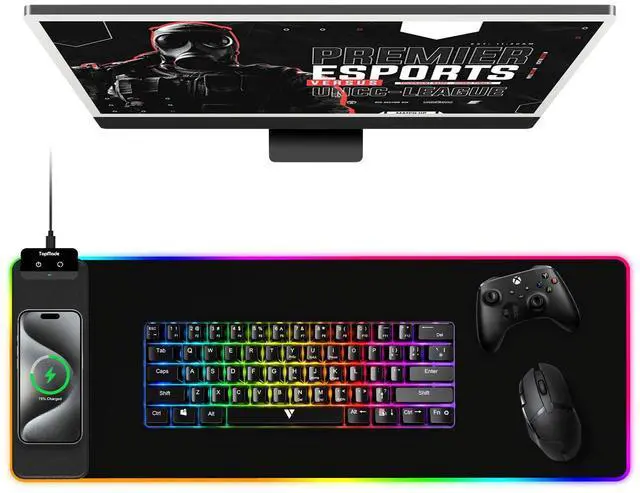 Extra Large RGB Mouse Pad with Magnetic Wireless Charging TopMade 2 in 1 RGB mouse pad is 31.5 x 11.81 large enough to fit your mouse, keyboard, and other desktop items, providing plenty of space for work or gaming; the round raised charging area has built-in powerful magnets that can be easily aligned with the wireless charging position to charge your devices, compatible with iPhone 16/15/14/13/12 series, AirPods with magnetic wireless charging case, and all Qi-enabled devices with magnetic cases
