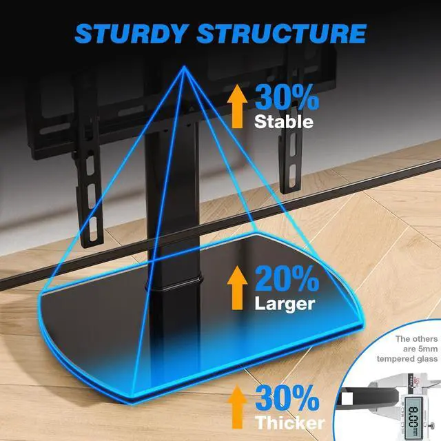STRONG STRUCTURE: The weight capacity of this TV stand mount is 88lbs. The whole table top TV stand including brackets and pole is made by heavy duty strong steel. The universal swivel table top tv stand is constructed with high-strength tempered glass with a thickness of 8mm, which is more resistant to pressure and impact and dramatically improves safety. The assembly is very easy. Please refer to the installation video to complete the mounting of the tv stand base replacement