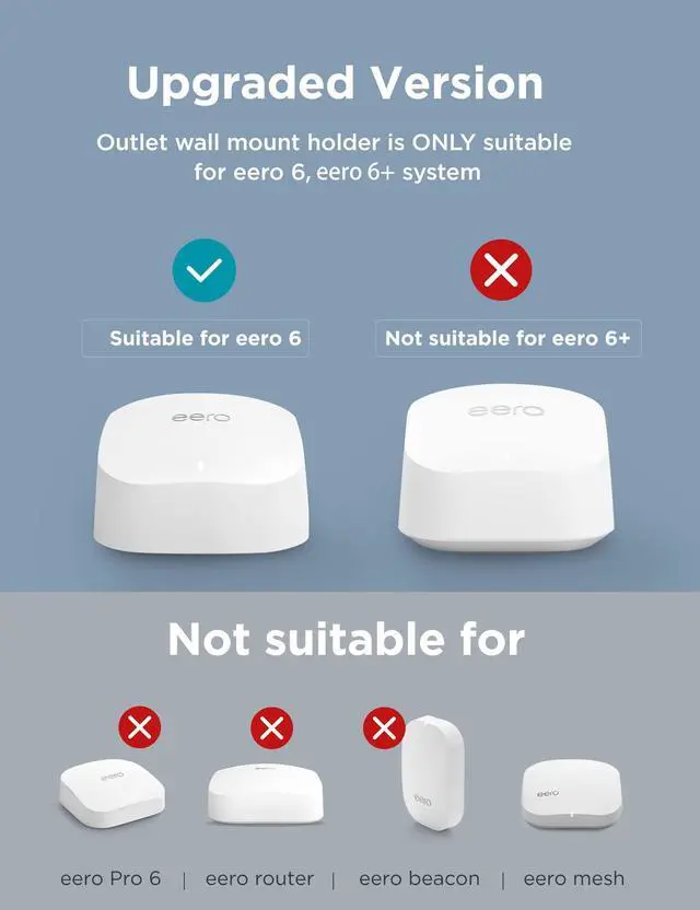 Upgraded Version: NOT FIT FOR eero 6+! This outlet wall mount is specially designed for for eero 6, mesh wifi system, NOT fit for the eero Pro 6 or eero mesh. Please confirm your eero device before purchase.