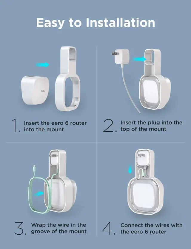 Cable Management:This mount for for eero 6, WiFi uses the cord that comes with your router and the cord groove allows simple storage of excess cable. Without messy wires any more, saving space while maintaining beauty.
