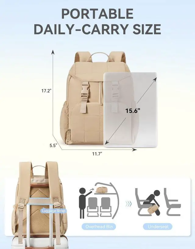 FEATHERWEIGHT: Experience the combination of softness and practicality with our puffy backpack. Crafted from soft and luxurious Taslan fabric, which is super-lightweight, water-resistant and durable, making it the ideal carry-on backpack. Dimensions: 17.2 × 11.7 × 5.5 inches, 1.31 lbs