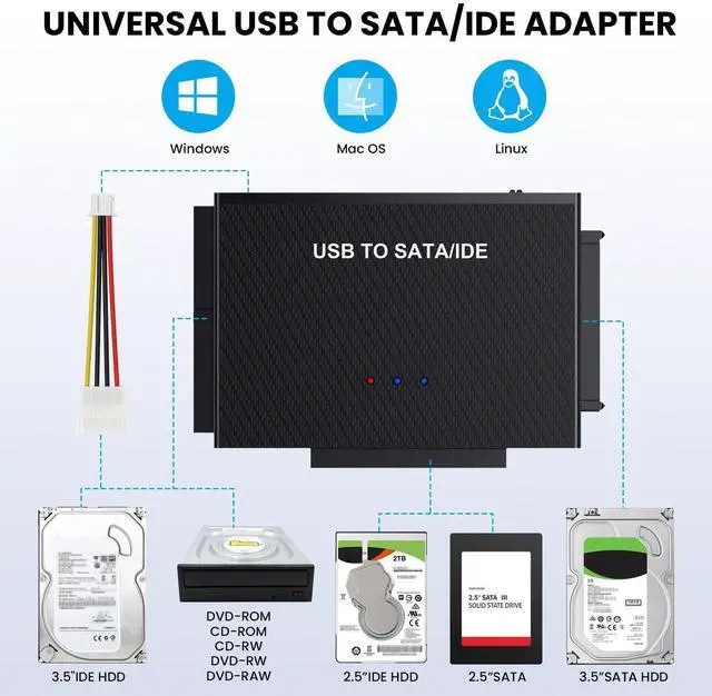 Universal Hard Drive Reader: This SATA USB adapter supports 2.5"/3.5" SATA HDD/SSD, 2.5"/3.5" IDE, DVD-ROM, CD-ROM, CD-RW, DVD-RW, DVD + RW optical drive.Supports drives with capacity of up to 6 TB. Play and plug, no drive required. Compatible with Windows 11/XP/Vista/7/8/10, Mac OS 10. X