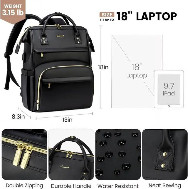 Upgraded LOVEVOOK Leather Laptop Backpack for Women: STURDY UPGRADED REINFORCED SEAMS. Made of high quality waterproof PU leather,thick shoulder straps,unique leather handles,no-slip zippers.HEAVY DUTY & DURABLE.Total of 2 compartments and 19 pockets,easy to organize all work necessities,college supplies,travel essentials.Dimensions: 18" x 13" x 8.3"; Weight: 3.15 lbs.