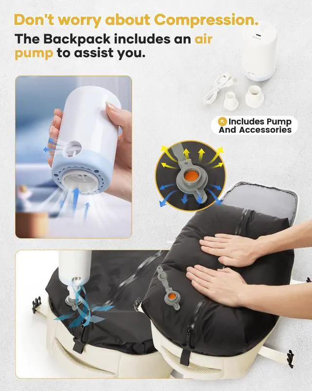 vacuum pumps - The backpack comes with a portable vacuum pump for easy carrying on the go. It also comes with a variety of pumping port accessories, which can meet different pumping needs, whether it is to quickly compress your luggage or adjust the packing space, it can provide you with great convenience.