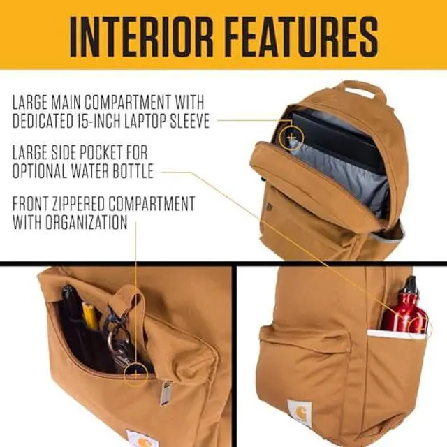 Elevate your daily carry with the Carhartt 21L Classic Backpack, a durable and functional travel backpack designed for men and women professionals, and outdoor enthusiasts. Whether you need a laptop backpack, backpack for leisure travel, or work backpack, this versatile pack has you covered. Constructed with 600-denier polyester and waterproof technology, this backpack for men and backpack for women keeps your gear dry and secure in any weather. The padded sleeve fits up to a 15"" laptop, making it perfect as a laptop backpack for men or laptop backpack women.