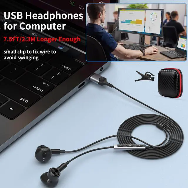 Comfort Wear and Magnetic Design: This USB headphones with lightweight design ensures comfort even during long sessions, reducing ear fatigue and providing an excellent in-ear fit.And semi in ear Earphones can keep the ear canal and earphone clean without pain and reduce hearing damage.This Magnetic usb headphones for laptop allow you to wear it around neck when you take the earbuds off to prevent wire tangled, And you can always reach them easily when you need to put them on