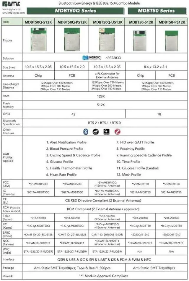 Raytacs MDBT50Q-U512K is a BT 5.2 stack (Bluetooth low energy or BLE) module designed based on Nordic nRF52833 SoC solution, which