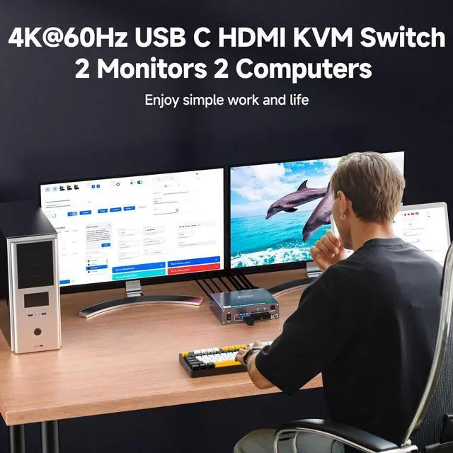 USB C Dual Monitor KVMThe docking station KVM switch connects 1 laptop+1 desktop and 2 monitors with 1x USB-C (MST)+dual HDMI inputs and 2x HDMI outputs. Seamlessly switch between your work desk and personal laptop to boost your productivity with this USB-C HDMI KVM switch.
