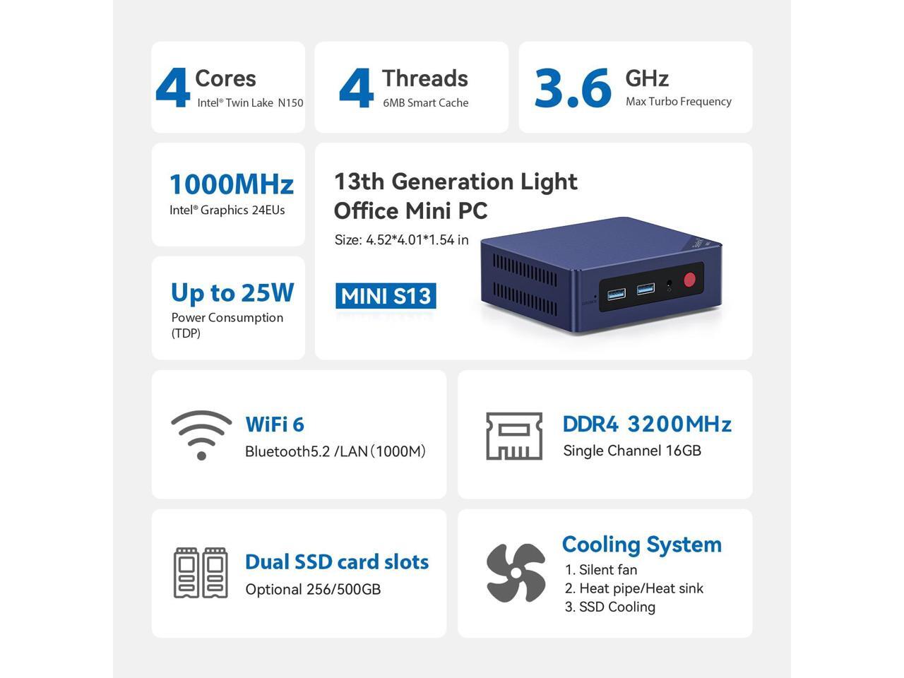 - Powerful Performance: Beelink MINI S13 Mini PC is powered by Quad-Core N150 (More Faster Than N100). The lithography process of the CPU is 7nm, and its base operating frequency is up to 3.6GHz (4C/4T) and it supports a 6MB smart cache. The micro pc create a smooth experience for your streaming video, visual home entertainment, and light office, bid farewell to system stalls and buffering.