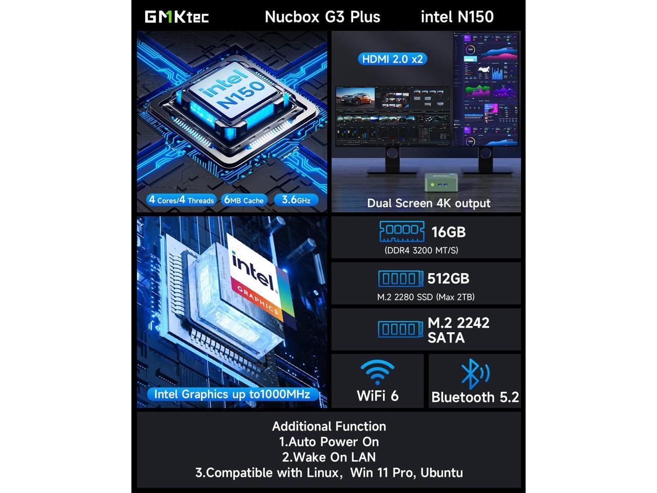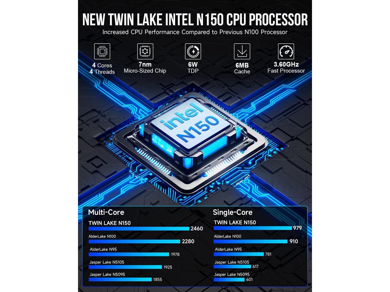- 2025 INTEL TWIN LAKE N150 PROCESSOR - The G3 Plus mini pc uses the latest Twin Lake N150 CPU 4 Core 4 Threads 6MB cache, base speed of 800Mhz with a burst speed up to 3.6GHz. As an upgrade of the Alder Lake N100, the N150 offers an overall performance improvement of 6%-10% and 15% improvement over the N95. Ideal for routine tasks, office work and home entertainment,which is more convenient than traditional desktop pc.