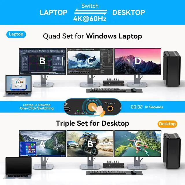 Powerful KVM Docking Station: This KVM switch not only allows your work laptop and personal computer to share 3 monitors and 1 set of keyboard mouse, but also share a 15 in 1 Docking Station, including USB 3.0 USB C DatePorts; Displayports; HDMI port; gigabit ethernet port; Micro SD/SD card slot, etc.; supports 60W fast charging and 100W power supply for your laptop; Its the ultimate docking station for productivity, entertainment, or creative work