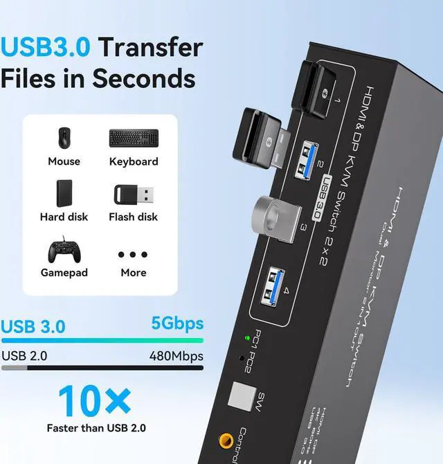 Support Ultra HD 4K@60hz VisualsThe hdmi+ dp kvm switch 2 monitors support resolution up to 3840*2160@60Hz(4K@60hz) and is backward compatible with 4K@30Hz,and 1080P@60Hz, Immerse yourself in the world of crystal-clear images,Brings you realistic visual enjoyment . Note: If you need to output 4K@60Hz resolution, please make sure your HDMI cable, computer and monitor support 4K@60Hz