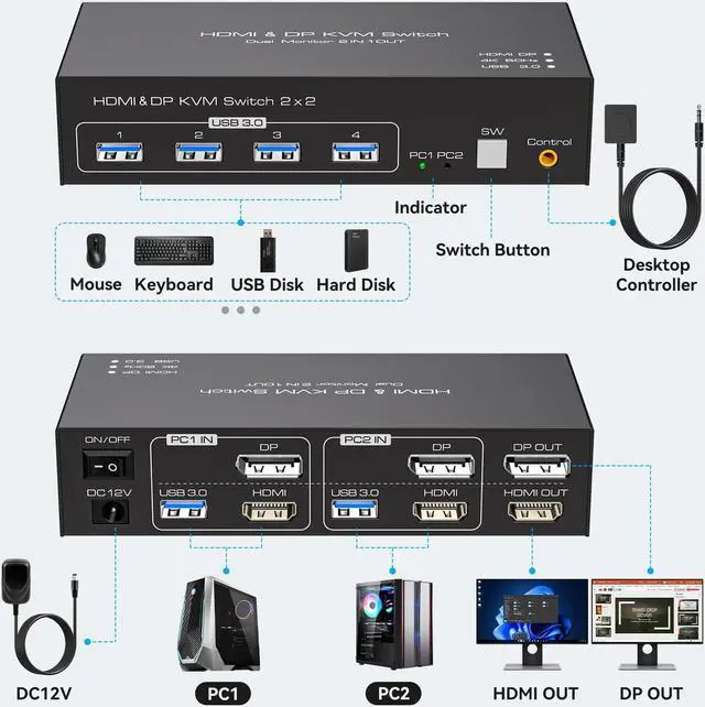 HDMI+Displayport KVM Switch 2 Monitors 2 Computers 4K@60Hz KVM Switcher for Two PC Share Dual Monitors and 4 USB 3.0 Ports Support Extended/Copy Mode with Desktop Controller&2 USB Cables