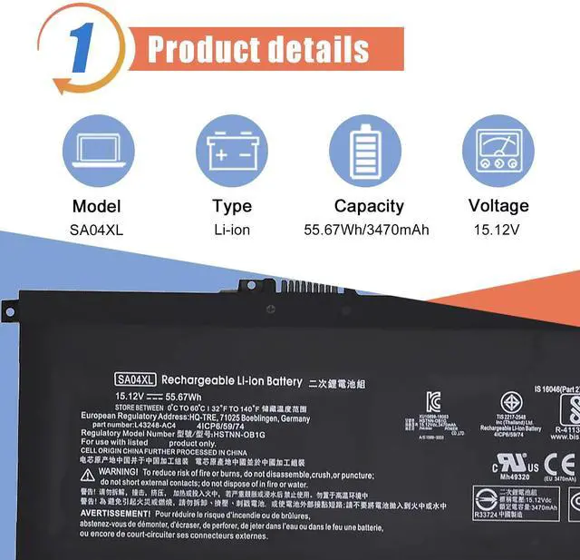 Battery DetailsModel: SA04XL. Voltage: 15.12V. Capacity:55.67Wh/3470mAh 4-Cell. Color: Black. 100% New from Manufacturer.Package includes: a battery + a manual + one set of tools for easy installation. (Please open the back case of your laptop and check out the exact part number of your laptop's original battery Before placing your order) Any questions you can contact with us via "Your Orders" tab in Amazon account, we will deal with it for you within 24 hours.