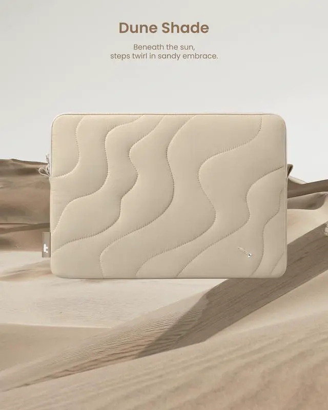 Terra Elegance: Crafted from recycled materials, this puffer laptop sleeve combines elegance with sustainability. Its distinctive contour line design creates timeless aesthetics, perfectly tailored to embrace your cherished MacBook
