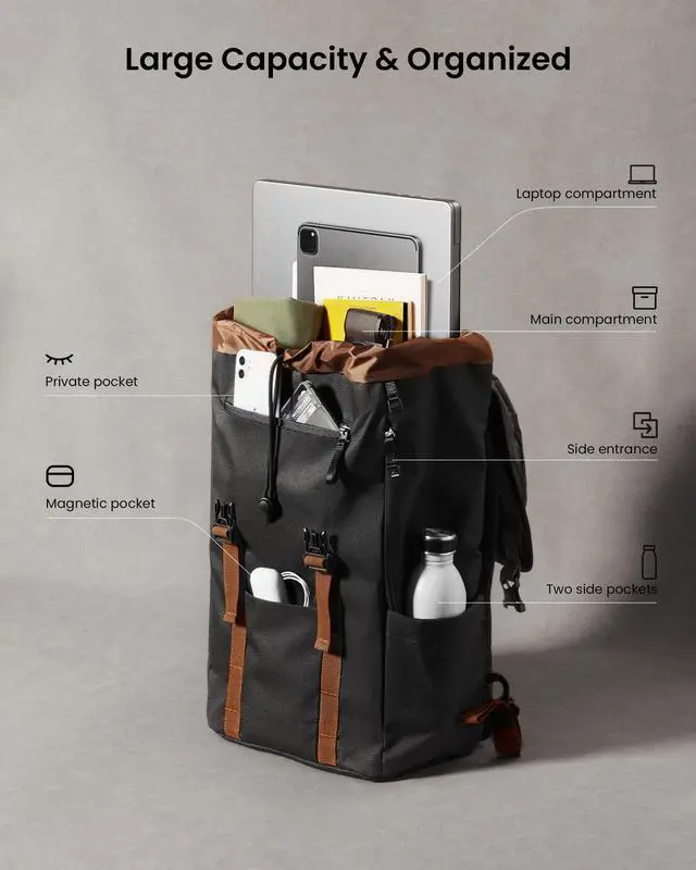 tomtoc Vintage Collection Backpack-VintPack TA1: the perfect blend of vintage style and practicality. With a spacious 22L capacity and roomy main compartment, this backpack has everything you need for city commuting and outdoor excursions. Features a classic flap design, both for being stylish and rain-resistant