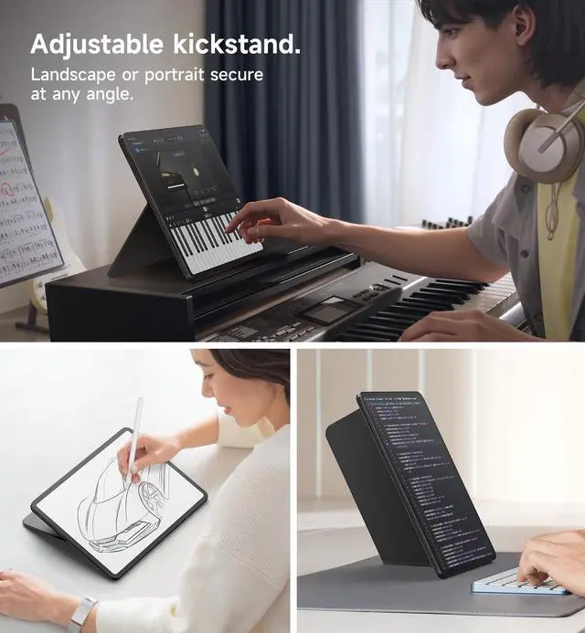 Super stable and adjustable stand: The foldable kickstand can be tilted up to 150°, offering in both landscape and portrait modes, and it's very stable, so you can enjoy hands-free entertainment whether you're using it on the desk, in bed, or resting it on your lap.