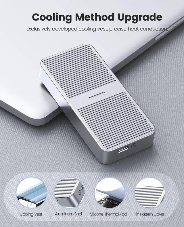 Heat Dissipation: After optimization and upgrading, the M224 M.2 ssd enclosure adopts ORICO's unique metal cooling vest, with a long silicone thermal pad, which wraps the SSD in all directions and conducts heat accurately. The heat dissipation efficiency is 20%-30% higher than that of ordinary M.2 solid state drive enclosures