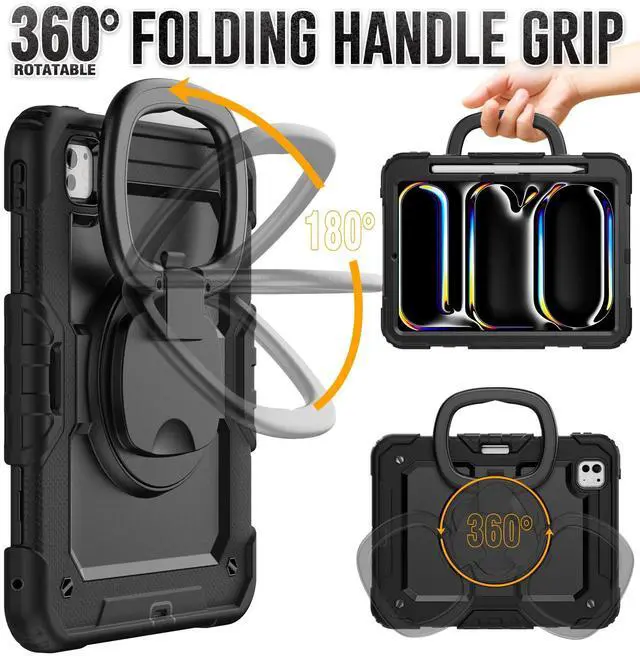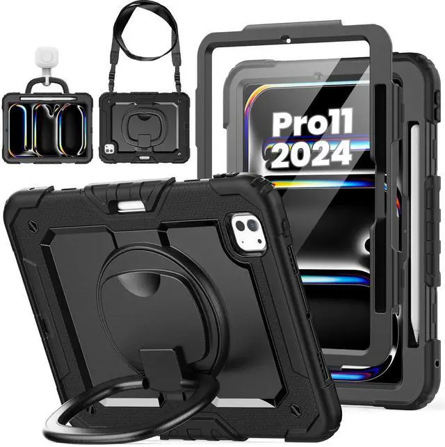 Case for iPad Pro 11 Inch 2024 M4: ZSLVPN Heavy Duty Shockproof Protective Case for iPad Pro 11 5th Generation with Screen Protector - Pencil Holder - Rotating Handle/Stand - Shoulder Strap, Black
