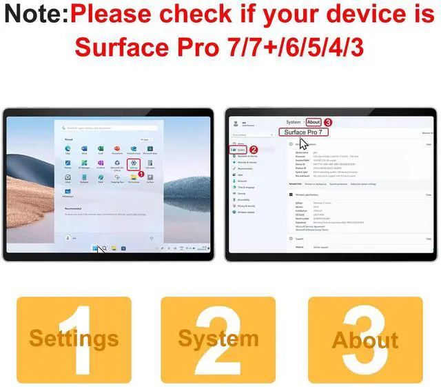 IMPORTANT: Bluetooth keyboard ONLY compatible with Microsoft Surface Pro 7, Pro 7/ Pro 7+/ Pro 6/ Pro 5/ Pro 4/ Pro 3 12.3inch, NOT for Surface Pro 11/10/9/8/X13inchand other models. PLEASE follow the steps to confirm your model: 1.Settings, 2.System,3. About(you can see your model name here)
