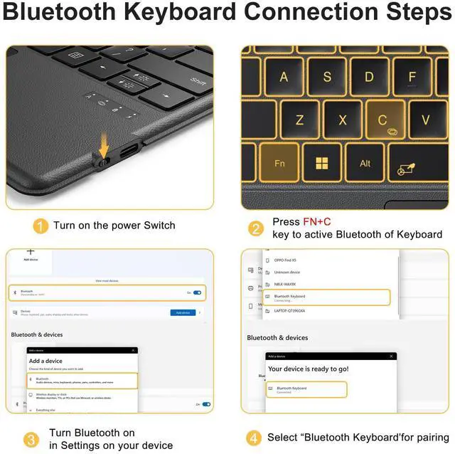 Manual Pairing MUSTIt only supports Bluetooth manual pairing. How to connect: Press F+C keys to active Bluetooth of Keyboard >Turn Bluetooth on in Settings on your device >Select"Bluetooth Keyboard"for pairing(Note: Magnetic automatic connection is not supported)