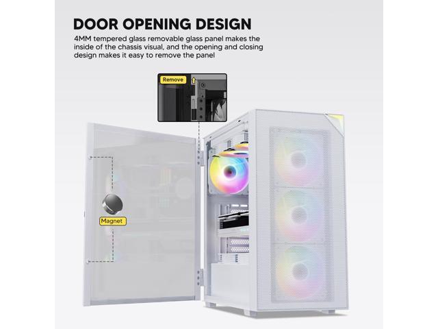 - Door Opening Design: Equipped with 4mm thick tempered glass, can clearly see the ARGB lighting and the components inside the case. The convenient door opening design makes it easier for you to assemble the interior of the case