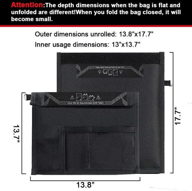 1.ATTENTION:The depth dimensions when the bag is flat and unfolded are different!When you fold the bag closed, it will become small.Dimensions when the bag is flat-13.8"X17.7" .Dimensions when the bag fold to closed-13x13.7.Three roll and Velcro closure. Each bag comes equipped with a clear pocket on the back to place a business card.It comes with a convenient key chain attachment, its portable and easy to carry