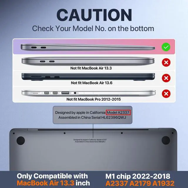 Check Your Model: Only compatible with MacBook Air 13 inch 2020 2019 2018 versions with Retina display and Touch ID. Before purchasing, please check the model number (A2337, A2179 or A1932) on the back of the laptop. # Not fit old model A1446 or other MacBook models