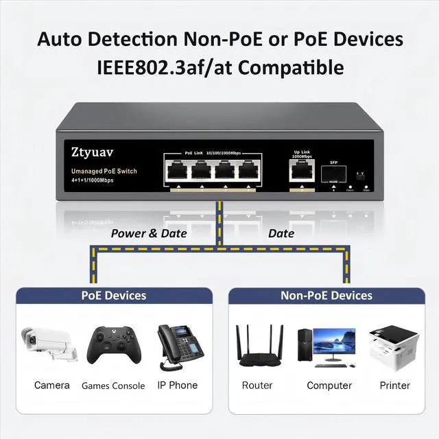 Ztyuav 6-Port Full Gigabit Unmanaged PoE Switch with 4 PoE+ Ports @75W, 1 Uplink and 1 SFP Slot-IEEE802.3af/at, PD Auto-Detection, VLAN Mode, 6KV Protection, Metal Fanless Plug and Play